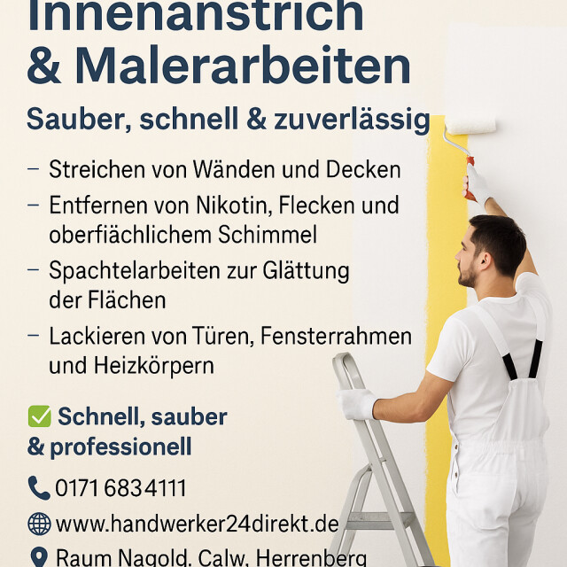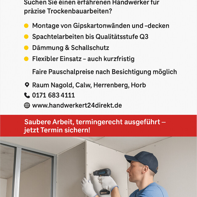 Handwerker24 DIREKT, ansässig in Nagold, bietet Ihnen ein breit gefächertes Spektrum an Handwerksdienstleistungen. Von hochwertigen Renovierungen, über fachmännische Malerarbeiten, Küchenmontage, bis hin zu sorgfältigen Montagearbeiten und der Pflege von Gärten und Landschaften - wir stehen für Qualität und Zuverlässigkeit. Unsere Expertise erstreckt sich zudem auf Bodenbelag, Bodenleger, Fußbodenverlegung, Heizungs-Kundendienst und Akustikbau, mit einem besonderen Fokus auf Laminat- und Massivparkettverlegungen sowie Parkettreparaturen.