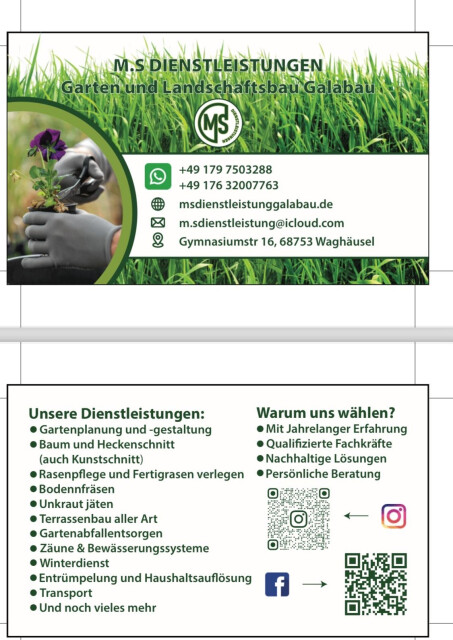 M.S Dienstleistungen in 68753 Waghäusel ist Ihr zuverlässiger Partner, wenn es um professionelle Gartenbau- und Gebäudereinigungsarbeiten geht. Mit jahrelanger Erfahrung, einer Leidenschaft für Detail und Qualität sowie einem hohen Maß an Zuverlässigkeit, setzen wir Maßstäbe in beiden Branchen. Unser Angebot umfasst vom präzisen Hecken schneiden über anspruchsvollen Galabau bis hin zu fachgerechten Baumfällungen eine breite Palette an Dienstleistungen.